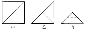 20.小许拿了一张正方形的纸片如图甲,沿虚线对折一次得图乙.再对折一次得图丙.然后用剪刀沿图丙中的虚线(虚线与底边平行)剪去一个角.打开后的形状是( ).