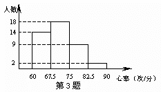 3.右图是某班学生在体检中测得每分钟心率频数的直方图,据此可知道该班参加体检学生的人数是 ,心率在范围 的学生最多,占统计人数的比例是 .