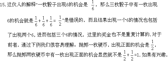我们还可以实地模拟,算一下:三枚骰子出现的不同点数情况有6×6×6=216种,所以假设在216次赌博中,各种情况的机会如下:
