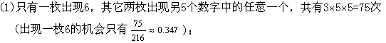 (2)两枚出现6,一枚出现另5个数字中的任意一个,共有3×5=15次;