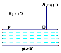 (本题8分)如图,大江的一侧有甲、乙两家工厂,它们都有垂直于江边的小路AD、BE,长度分别为3千米和2千米,两条小路相距10千米.现在要在江边建一个抽水站,把水送到甲、乙两厂去.欲使供水管路最短,抽水站应建在哪里?