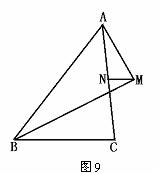 1.如图9,△ABC中,BM平分∠ABC,AM⊥BM,垂足为M,点N为AC的中点,设AB=10,BC=6,求MN的长度.