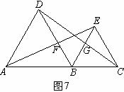 30、⑴如图7,已知A、B、C在一条直线上,分别以AB、BC为边在AC同侧作等边三角形ABD和等边三角形BCE,AE交BD于点F,DC交BE于点G。