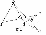 ⑵如图8,如果A、B、C不在一条直线上,那么AE=DC和BF=BG是否仍然成立?并请加以说明。