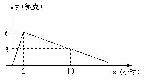 27、某医教研究所开发一种新药,在试验药效时发现,如果成人按规定剂量服用,那么服药后2小时时,血液中含药量最高,达每毫升6微克,接着逐步衰减,10小时时血液中含药量为每毫升3微克,若每升血液中含药是y(微克)随时间x(小时)的变化如图所示,当成人按规定剂量服药后。