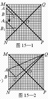 (1)如图15-1,当Rt△ABC向下平移到Rt△A1B1C1的位置时,请你在网格中画出Rt△A1B1C1关于直线QN成轴对称的图形;