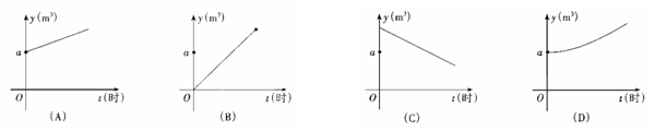 如图,一水库现蓄水a立方米,从开闸放水起,每小时放水b立方米,同时从上游每小时流入水库2b立方米,那么到水库蓄满水为止,水库蓄水量y(立方米)是开闸时间t(时)的函数,其图象只能是图中的( ).