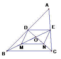 25、(本题9分)如图,在△ABC中,D、E分别是AB、AC的中点,BE和CD交于点O,M、N分别是OB、OC的中点。