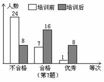 7.某校初二年级全体320名学生在电脑培训前后各参加了一次水平相同的考试,考分都以同一标准划分成“不合格”、“合格”、“优秀”三个等级,为了了解电脑培训的效果,用抽签方式得到其中32名学生的两次考试考分等级,所绘制的统计图如图所示,试结合图示信息回答下列问题:
