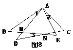 27。如图8,已知:AB=AD,AC=AE,∠1=∠2,猜想∠1与∠3的大小关系,并证明你的猜想。