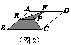4、如图2,菱形ABCD的对角线的长分别为2和5,P是对角线AC上任一点(点P不与点A、C重合),且PE∥BC交AB于E,PF∥CD交AD于F,则阴影部分的面积是_______.