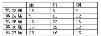 4. (8分)下表给出了我国运动员在第23届至第27届奥运会上获得奖牌情况,