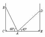 (7分)如图,在两面墙之间有一个底端在A点的梯子,当它靠在一侧墙上时,梯子的顶端在B点;当它靠在另一侧墙上时,梯子的顶端在D点.已知∠BAC=60°,∠DAE=45°.点D到地面的垂直距离DE=
