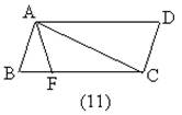 11.如图,已知平行四边形ABCD中,AB=2,AD=4,BF∶FC=1∶3,则⊿ABF与⊿ADC的面积比是________。