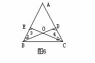 11、如图6,△ABC中,D、E分别是AC、AB上的点,BD与CE交于点O,给出下列四个条件:(1)∠1=∠2,(2)∠3=∠4,(3)BE=CD,(4)OB=OC