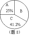 8、如图,用整个图表示全校三个年级的总人数2400人,那么扇形B代表_________人,扇形B的圆心角为_________度。
