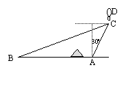 如图,在小山的东侧A处有一热气球,以每分钟28米的速度沿着与垂直方向夹角为300的方向飞行,半小时后到达C处,这时气球上的人发现,在A处的正西方向有一处着火点B,5分钟后,在D处测得着火点B的俯角是150,求热气球升空点A与着火点B的距离。(结果保留根号,参考数值: