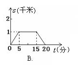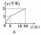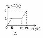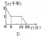10、(泉州市2006)小明所在学校离家距离为2千米,某天他放学后骑自行车回家,行驶了5分钟后,因故停留10分钟,继续骑了5分钟到家.下面哪一个图象能大致描述他回家过程中离家的距离