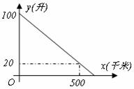 (宜昌市2006)某汽车生产厂对其生产的A型汽车进行耗油量实验,实验中汽车视为匀速行驶。已知油箱中的余油量y(升)与行驶时间t(小时)的关系如下表,与行驶路程x(千米)的关系如下图。请你根据这些信息求A型车在实验中的速度。