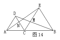 25(本题5分)如图14,ΔACD、ΔBCE都是等边三角形,ΔNCE经过旋转后能与ΔMCB重合.请回答: