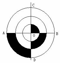 2、如图所示,AB是长为4㎝的线段,且CD⊥AB于点O,你能借助旋转的方法求出图中的阴影部分的面积吗?