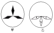 3、某种产品的标志图案如图甲所示,要在所给的图形乙中,把A、B、C三个菱形通过一种或几种变换,使之变为与甲所示的图案。