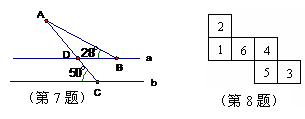 7、如图所示,直线a∥b,则∠A的度数是……………………………………( )
