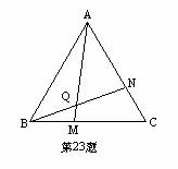 23、如图,△ABC为等边三角形,点M、N,分别在BC、AC上,且BM=CN,AM与BN交于Q点,求∠AQN的度数。(6分)