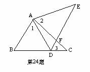 24、如图,点E在△ABC的外部,点D在BC边上,DE交AC于点F,若∠1=∠2 =∠3,AC=AE,求证:AB=AD。(6分)
