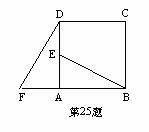 25、如图,在正方形ABCD中,E是AD中点,F是BA延长线上一点,AF= AB,则线段BE与DF大小,位置有什么关系?并证明你的结论。(7分)