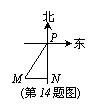 14.如图,一艘轮船向正东方向航行,上午9时测得它在灯塔P的南偏西30°方向,距离灯塔120海里的M处,上午11时到达这座灯塔的正南方向的N处,则这艘轮船在这段时间内航行的平均速度是 海里。