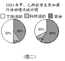 25.下面两幅统计图(如图一、图二),反映了某市甲、乙两所中学学生参加课外活动的情况.请你通过图中信息回答下面的问题(实线是甲学校,虚线是乙学校).