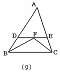 9、如图,△ABC中,∠ABC、∠ACB的平分线交于点F,过点F作DE∥BC,分别交AB、AC于D、E,已知△ADE的周长为24厘米,且BC=8厘米,则△ABC的周长为 ▲ 厘米。
