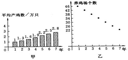 12.甲、乙两人连续7年调查我县某养鸡业的情况,提供了两方面的信息图 甲调查表明,养鸡场平均产鸡从第一年的1万只上升到第7年的2.8万只;乙调查表明,养鸡场的个数由第一年的46个减少到第7年的22个.现给出下列4个判断:①该县第二年养鸡场产鸡的数量为1.3万只;②该县第二年养鸡场产鸡的数量低于第一年养鸡场产场的数量;③该县这7年养鸡场产鸡的数据逐年增长;④这7年中,第五年该县养鸡场鸡的数量最多.根据甲、乙两人提供的信息,可知其中正确的判断有( )