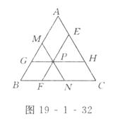 17.如图19-1-32,△ABC是边长为4cm的边三角形,P是△ABC内的任意一点,过点P作EF∥AB分别交AC,BC于点E,F,作GH∥BC分别交AB,AC于点G,H,作MN∥AC分别交AB,BC于点M,N,试猜想:EF+GH+MN的值是多少?其值是否随P位置的改变而变化?并说明你的理由。