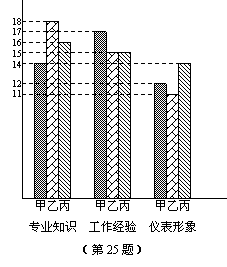 26、(9分)金鹰集团对应聘者甲、乙、丙进行面试,并从专业知识、工作经验、仪表形象三方面给应聘者打分,每一方面满分20分,最后的打分制成条形统计图(如图).