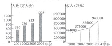 近年来,某市旅游事业蓬勃发展,吸引了大批海内外游客前来观光旅游、购物度假,下面两图分别反映了该市2001-2004年游客总人数和旅游业总收入情况。