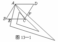 (2)当三角尺的两边分别与菱形的两边BC,CD的延长线相交于点E,F时(如图13-2),你在(1)中得到的结论还成立吗?简要说明理由.