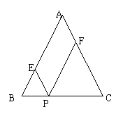 (本小题8分)小明和小东经常在一块等腰三角形的草坪上玩耍,一天他们发现了一个有趣的现象:如图的草坪是等腰△ABC,AB=AC,他们两人同在BC边上一点P,然后小明沿AC平行线PE(点E在AB上)、EA走向A处,小东沿BA的平行线PF(F点在AC上)、FA走向A处,当他两个步行速度一样时,他们同时到达A点,并且在BC边上不断改变P点位置。在步行速度一定时,到达A处的时间也完全一样,你知道为什么吗? 说说你理由。