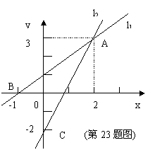 23、(8分)如图,直线l1、l2相交于点A(2,3),l1与x轴交于点B(-1,0),l2与y轴交于点C(0,-2)。