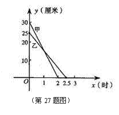 27、(12分)在一次蜡烛燃烧试验中,甲、乙两根蜡烛燃烧时剩余部分的高度y(厘米)与燃烧时间x(小时)之间的关系如图所示,请根据图象所提供的信息解答下列问题:
