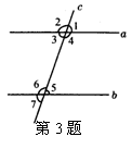 3、如图,直线a、b被直线c所截,现给出下列四个条件:(1)∠1=∠5;(2)∠1=∠7;(3)∠2+∠3=180°;(4)∠4=∠7,其中能判定a∥b的条件的序号是( )