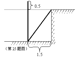 (本题6分)如图,小刚准备测量一条河的深度,他把一根竹竿插到离岸边1.5米远的水底,竹竿高出水面0.5米,再把竹竿的顶端拉向岸边,竿顶和岸边的水面刚好相齐;请计算并推断河水的深度为几米?