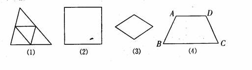 23、已知,连结三角形三边中点,把任意三角形分成四个小三角形,它们的形状,大小完全相同,并且与原三角形相似,如图(1)请把图(2)、(3)、(4)同样分成四块,使它们形状大小相同,且都和原图形相似,(注:图(2)为正方形,图(3)为菱形,图(4)为等腰三角形,且AD//BC,AB=CD=AD,∠B=60°)(7分)