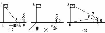 24.新域广场省政府办公楼前,五星红旗在空中飘扬,同学们为了测出旗杆的高度,设计了三种方案,如图(1),图(2),图(3)所示,并测得(1)中,BO=60米;OD=3.4米,CD=1.7米;图(2)中,CD=1米,FD=0.6米,EB=18米;图(3)中,BD=90米,EF=0.2米,此人的臂长(GH)为0.6米。请你任选其中的一种方案。
