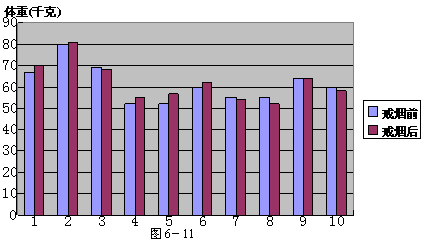 (1)根据条形统计图(图6-11所示),你能用表格列出这10人戒烟前后的体重吗?