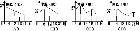 1、一天,亮亮发烧了,早晨他烧得很厉害,吃过药后感觉好多了,中午时亮亮的体温基本正常,但是下午他的体温又开始上升,直到半夜,亮亮才感觉身上不那么发烫了,下面各图能基本上反映出亮亮这一天(0时-24时)体温的变化情况的是( )