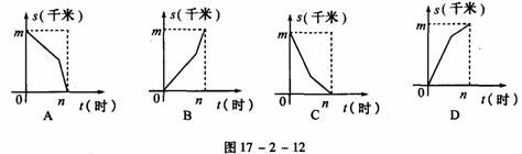 4、丹家距学校m千米,一天她从家上学先以a千米/时的速度跑步锻炼前进,后以匀速b千米/时步行到达学校,共用n小时图17-2-12份中能够反映李丹同学距学校的距离s(千米)与上学的时间t(小时)之间的大致图象是 ( )
