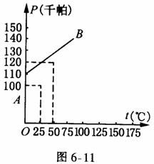 2 (2002年济南中招题) 科学家通过实验探究出一定质量的某气体在体积不变的情况下,压强P(千帕)随温度t(℃)变化的函数关系式是P=kt+b,其图象如图6-11所示的射线AB.
