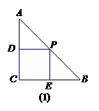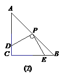 在△ABC中,AC=BC,∠C=90°,将一块三角板的直角顶点放在斜边AB的中点P处,将三角板绕P点旋转,三角板的两直角边分别交AC、CB于D、E两点,如图(1)、(2)所示。